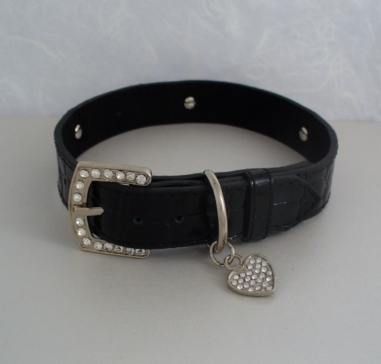 Collier effet « croco » de couleur noire décoré de 3 cœurs en strass cerclés de métal argenté